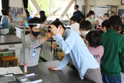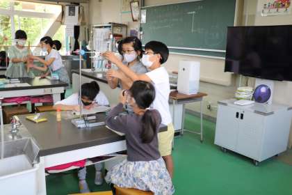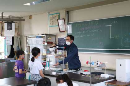 5年生の理科の授業の様子です。ふりこを1秒で1往復させるために紐の長さを話し合いながら調整していました。どの子も真剣に考えていました。