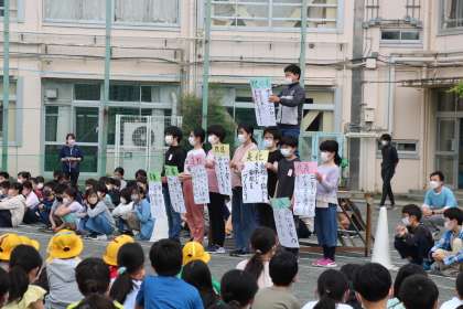 金曜日の朝は、全校集会があります。今日は、委員長紹介集会です。