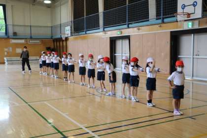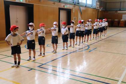 今日は、背の順並びも練習しました。私が見に来たので「校長先生にも見せてあげよう!」と、並ぶところを見せてくれました。自由にお散歩をして、体育館の中を好きなように動きます。先生の