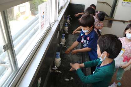 4時間目も終わりに近づくころ、一足早く手を洗い始めて給食の準備をする1年生です。自分たちでいろいろなことができるようになってきましたが、ゆったりできるように、早め早めに準備です。