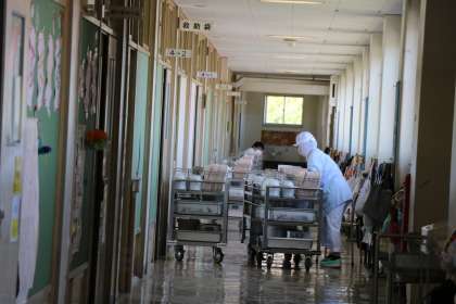 廊下では、静かに給食台車を運ぶ調理スタッフの方の姿が。1人で3台もの台車を同時に運んでいるので、声をかけると。