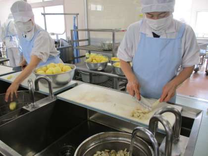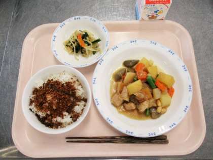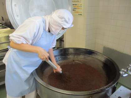 給食室はふりかけも手作りしています。調味料と粉かつおをあわせた後、さらさらになるまでよくからいりして作ります。手作りでつくるふりかけは余計な添加物もなく、栄養たっぷりでとてもおいしいです。