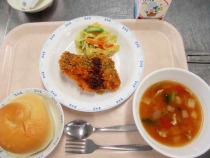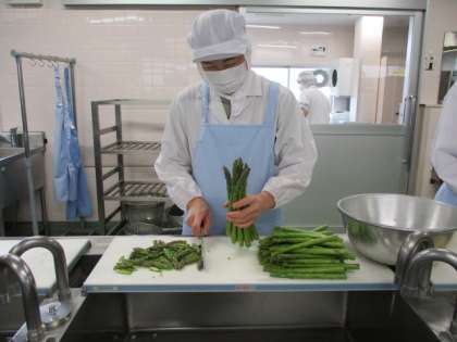 今日のサラダには今が旬のアスパラガスが入っています。アスパラガスはカロテン、ビタミンC,E,B群が多い緑黄色野菜です。疲労回復効果のあるアミノ酸のアスパラギン酸が多くふくまれています。こどもたちは毎日給食を楽しみにしてくれています。通りがかりにサンプルケースをのぞいたこども達は「今日もおいしそう!」とニコニコしていました。