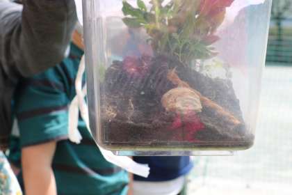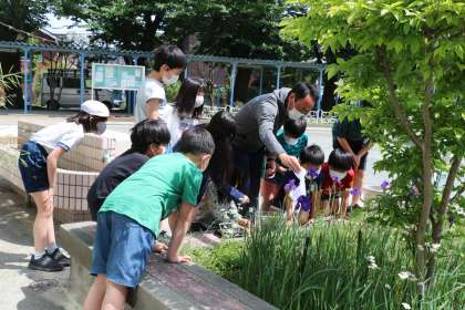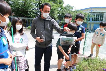 遊びが始まる前に、理科室にあったカマキリの卵がかえったので、草むらにもどしています。小さくてかわいいカマキリの赤ちゃんです。