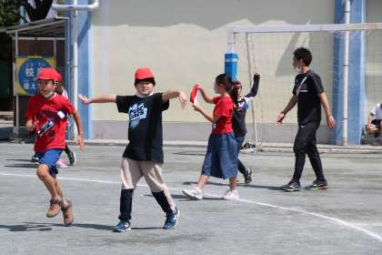 鬼決めをして、鬼ごっこの開始です。白帽子が逃げ始めます。その後ろを赤帽子の鬼チームがどこから攻めようか、数を数えながらじりじり歩き始めました。