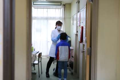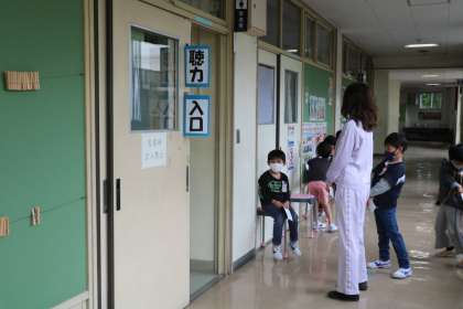 グループに分かれて数人ずつ検査に来ます。教室で待っている子たちは静かに自習をしていました。検査の順番を待つ子たちも、静かに待つことができます。1年生立派です。