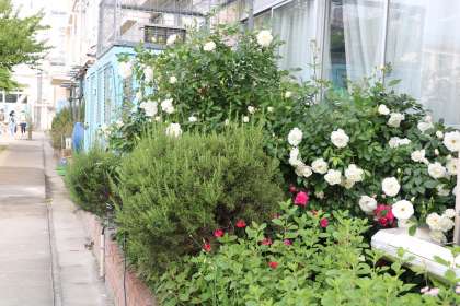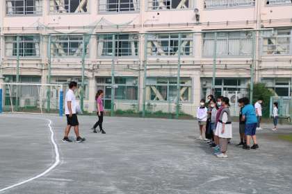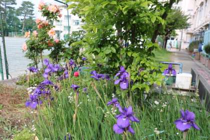 校庭では、集会の最終練習をしています。いたるところの草花がきれいに咲いています。