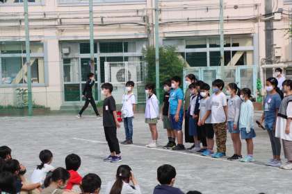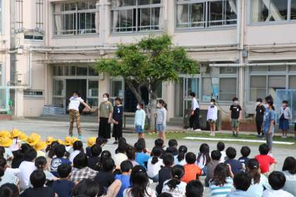 今日は、開校記念集会を集会委員会が計画しました。始めに、プレゼントの横断幕を披露しました。太鼓のドラムスクロールに合わせて、集会委員会が広げると、子どもたちから「うわ〜」という歓声が上がりました。