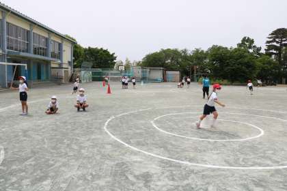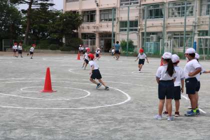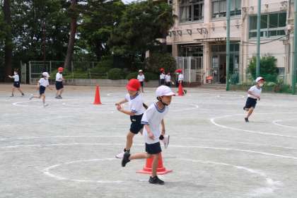 2年生体育・走の運動遊びの様子です。チームごと、渦巻きの中を上手にバランスを取りながら走ります。前の走者の子が、中心のコーンにタッチしたら次の走者がスタートします。「10数えるうちにタッチしよう!」「今度は5でタッチできるように挑戦しよう!」など互いに声をかけ合い、がんばっています。
