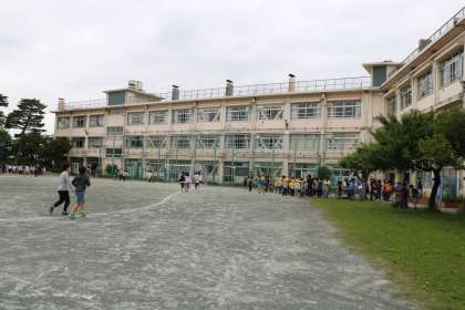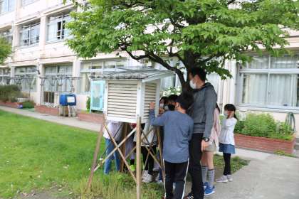 月曜日朝のランランランが始まりました。今日は5年生です。周りで、百葉箱の中の温度計の気温を確認したり、学年ごとに整列したりしながら待っています。