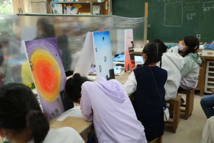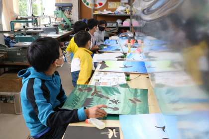 5年生図工「グラデーションすてきな景色」の作品鑑賞の様子です。友達の作品のよかったところを発表したり、自分のがんばったところを発表したりしています。互いの作品を、その作品のよさを、本当によく見ています。