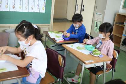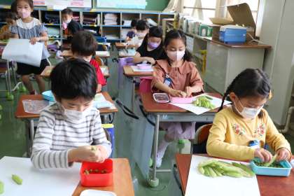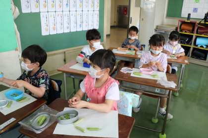 栄養士の先生から、グリンピースの花を教えてもらったり、さやのむき方を教えてもらったりしてから、いよいよスタートです。