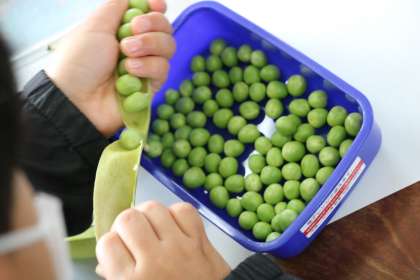 一生懸命むいたグリンピースを、大事に集めて、給食室にお届けします。