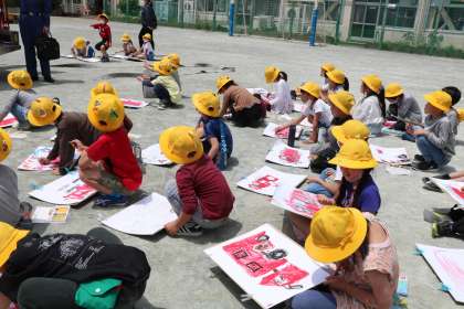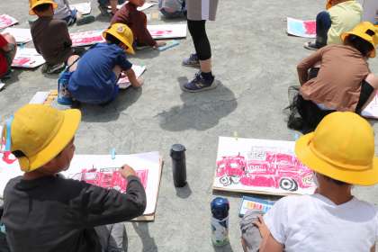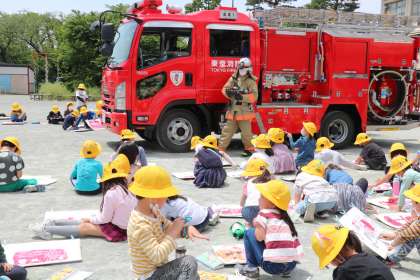 今日は校庭に、本物の消防車と、消防士さんが来てくれて消防写生会です。