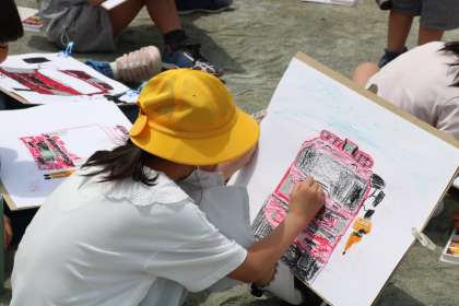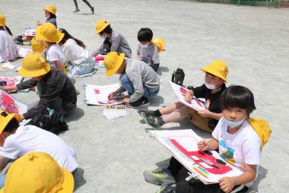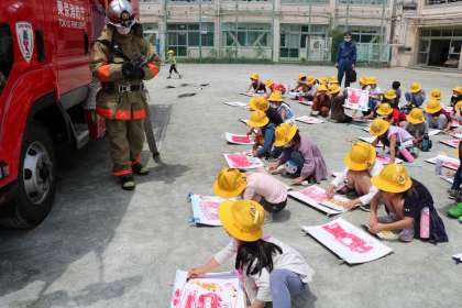 暑い中だったので、消防士さんも大変でしょう。でも消防士さんは、子どもたちの絵を見てたくさん褒めてくださいました。嬉しいですね。さらにがんばる子どもたちです。
