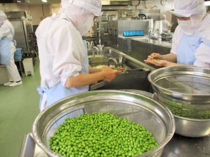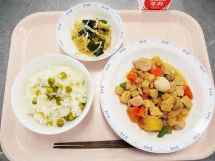 1年生が給食室までむいたグリンピースを持ってきてくれた後、給食室で大切に洗い、ごはんと一緒にたきました。とってもおいしいグリンピースごはんができました。