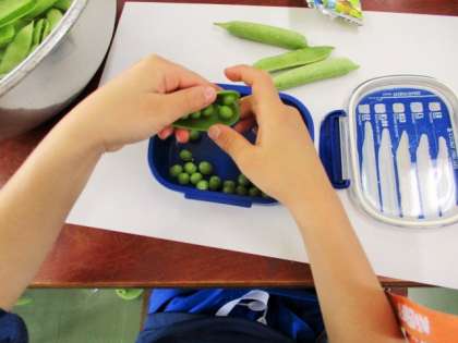 生活科の授業で1年生がグリンピースのさやむきを行いました。