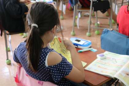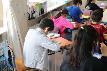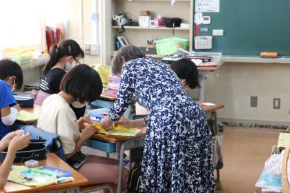 5年生の家庭科の授業です。裁縫の実技をしていました。練習用の布を使って一生懸命針で縫う練習をしていました。裁縫でいろいろな物を作れるようになれるといいですね。
