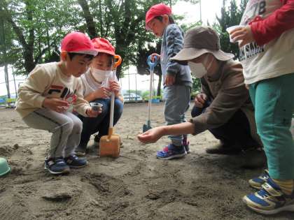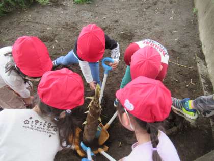ゴールデンウィークの合間には、タケノコを見つけて大喜び。「掘りたい!」とシャベルを取りに行き、掘り上げるまで頑張りました。
