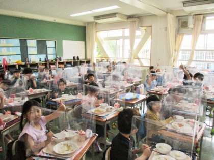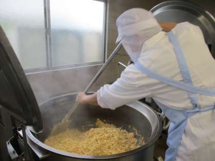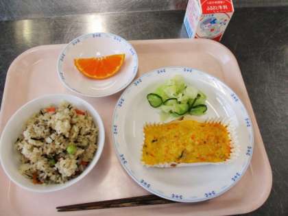 今日の混ぜご飯はひじきや細切りにした昆布が入っている「磯ごはん」です。ごはんに混ぜ込むことで不足しがちな海藻をおいしくとることができます。擬製豆腐は、つぶした豆腐と野菜、卵をあわせて焼いたものです。昔、卵を食べることを禁止されていたお坊さんが豆腐でカモフラージュして卵を食べるために作った料理と言われています。