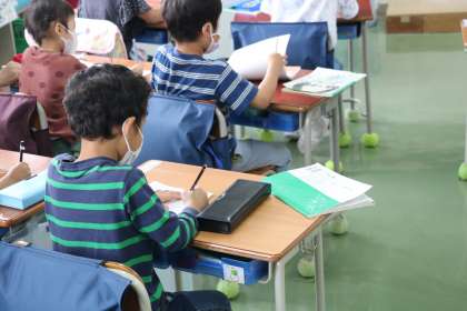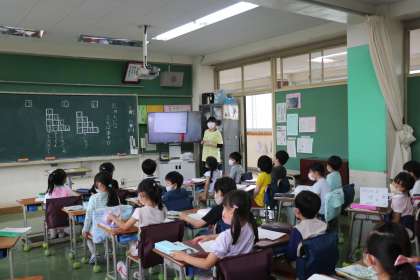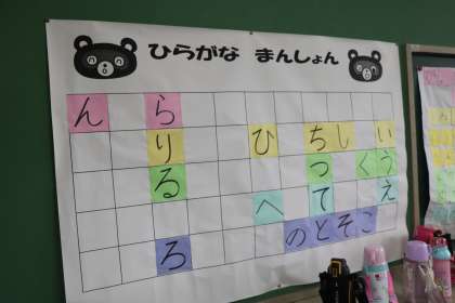 1年生の国語の授業です。国語のノート指導を行っていました。先生がテレビに写した通り丁寧にノートをとっていました。きれいなノートでたくさんはなまるをもらえるといいですね。教室の後ろには、習ったひらがなが掲示されていました。習ったひらがなもどんどん増えています。