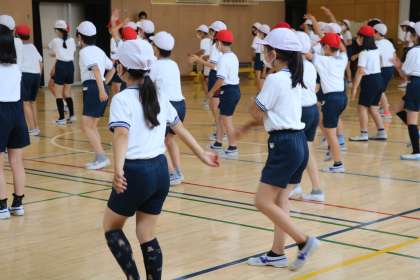 5年生の体育の授業です。学年で運動会で踊る表現運動の練習をしていました。先生の手本をよく見て一つ一つの動きを確認していました。今月末の運動会に向けてがんばっています。