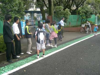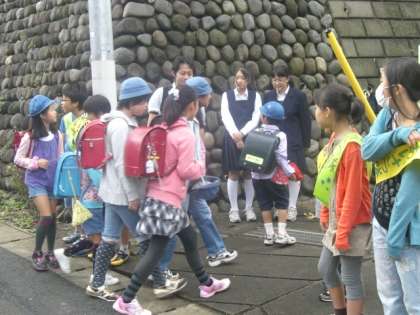 本校を卒業した砧中学校の生徒が、代表委員会の子どもたちとあいさつの推進を