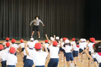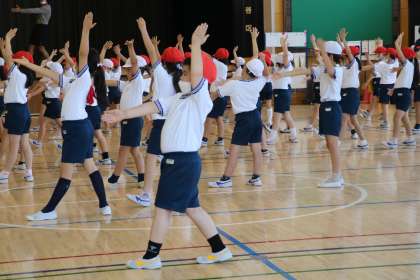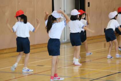 2年生の運動会練習です。体育館で表現運動の練習をしていました。先生のお手本をよく見て踊っていました。とても集中して取り組めていました。