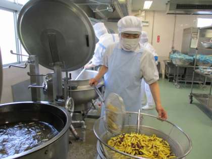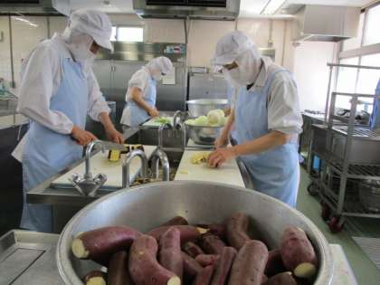 シナモンポテトに使用したさつまいもは全校分で約150本ありました。それを拍子切りにして、油で揚げた後、シナモンと粉砂糖をまぶして作りました。たくさんのさつまいもを切るのは大変でしたが、喜んで食べてもらえたら嬉しいです。