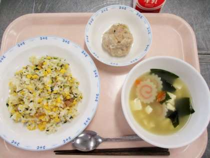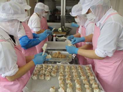 今日は570個のしゅうまいを給食室で手作りしました。ふつうのしゅうまいの2倍以上ある大きなしゅうまいです。きゃべつやたまねぎなど野菜もたっぷり入っています。