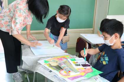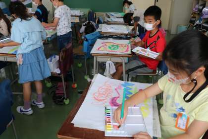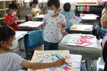2年生図工「絵具島」の様子です。水の色を加減しながら筆を動かしています。自分の思いをたくさんお話ししてくれるので、教室にいるのが楽しいです。