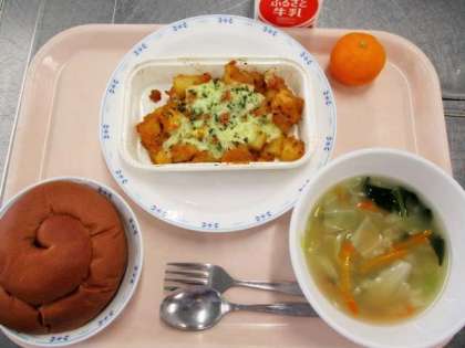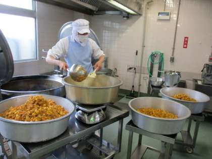 新じゃがいもを使ってポテトグラタンを作りました。使用したじゃがいもの量は全部で60kg。皮をむいて芽をとり、1.5センチ角に切って、蒸して…と今日は大量のじゃがいもを調理しました。ミートソースも手作りし、蒸したじゃがいもと合わせて、チーズをのせて、オーブンで焼きました。新じゃがいものおいしいさを生かしたポテトグラタンができました。