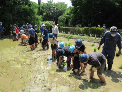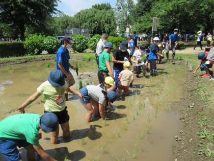 いいお天気の中、砧小学校の5年生と一緒に次太夫堀公園の田んぼに行って、田植えをしてきました。優しいお兄さんやお姉さん、次太夫堀の田植えを支えていらっしゃる方々、皆さんに教えてもらったり、手伝ってもらったりしながら、ぬかるんだ田んぼに入り苗を植えて、田植えも、泥の感触も思い切り楽しみました。