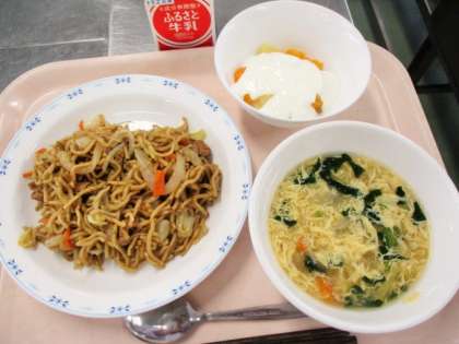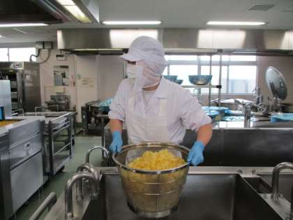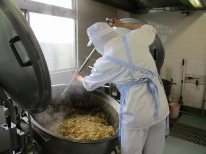 写真は給食室でやきそばを炒めているところです。大きな給食室の釜を3つ使って炒めます。大量のやきそばを炒める調理作業は大変ですが、こどもたちのよろこぶ顔を思い浮かべながら炒めていました。
