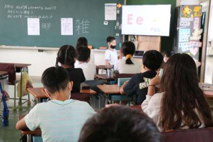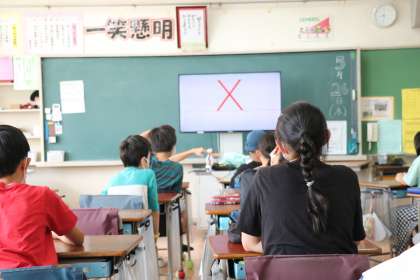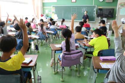 写真は5年生の外国語、2年生の国語の朝学習の様子です。
