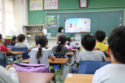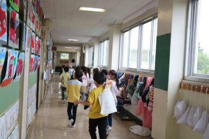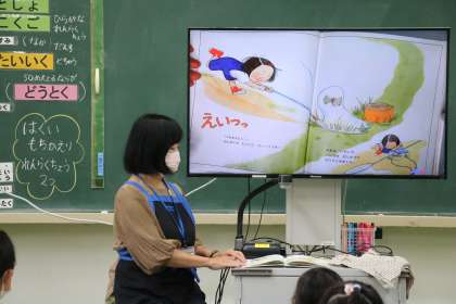 1年生図書の時間の様子です。司書の先生に絵本の読み聞かせをしてもらってから、返却する本をもって図書室へ向かいます。