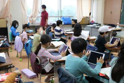 3年生国語「こまを楽しむ」の学習の様子です。タブレットに自分の好きな「こま」について書き、友だちと共有するのだそうです。友達の意見が一堂に見れていいですね。