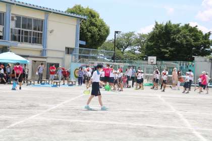 砧の学び舎・砧中学校の1・2年生です。砧の学び舎とは、砧中学校を中心に砧小学校・幼稚園、山野小学校、明正小学校からなるグループです。一緒に様々な取り組みをしていますが、その一つとして、運動会ボランティアに来てくれました。今日は17人も参加してくれて、主に1年生のサポートと校庭整備、用具準備、最後の後片付けまでやってくれました。写真は競技の合間に校庭に水をまいている様子です。顔見知りの先輩に、小学生も大喜びでした。
