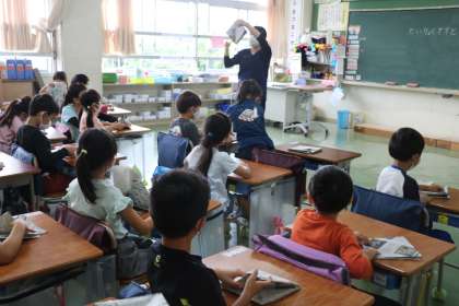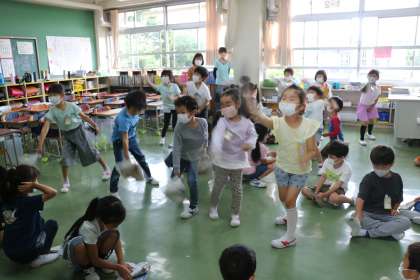 1年生体育の様子です。雨で校庭が使えないので、9日に実施されるスポーツテストの話を聞き、室内でできる練習を教室でしています。