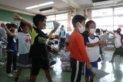 新聞紙で、パンとなる紙風船を作って、ボールを遠くに投げるコツを教わっています。