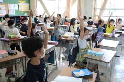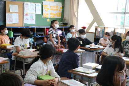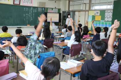 3年生日本語「ことばっておもしろい」の学習の様子です。同じ音でちがう意味の言葉を考えています。とても意欲的な子どもたち。名前を呼ばれたら「はい」と返事をして発言します。発言する友達の方に体や顔を向けながら聞く姿に、学級の温かさが伝わります。