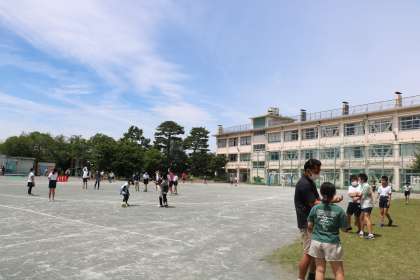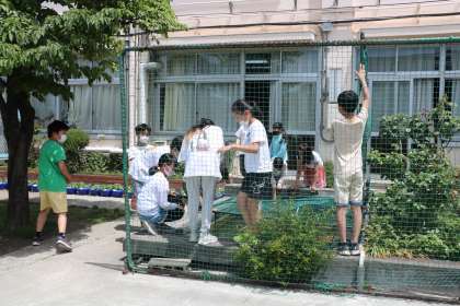 芝生の上で遊んだり、理科で使う花壇の手入れを手伝ったり、池のメダカをすくうお手伝いもしています。