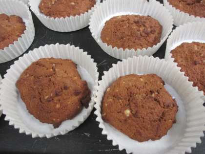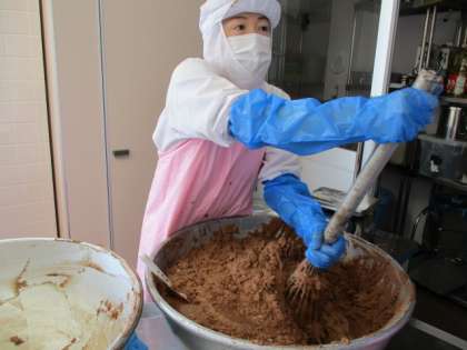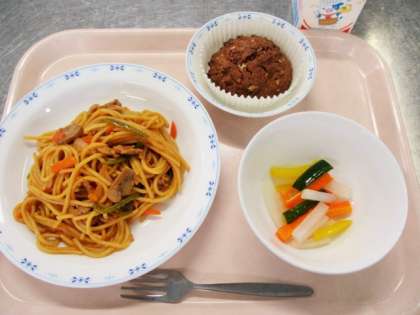 おからマフィンはおからを入れたココア味の手作りケーキです。おからマフィンが焼き上がると給食室中にココアの甘い香りがいっぱいになりました。学校内に給食室があるので、給食が近づくとおいしそうなにおいが教室まで届きます。こどもたちは毎日、そのにおいで今日の給食を想像して楽しみにしてくれています。
