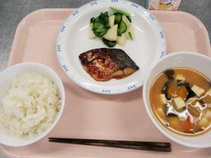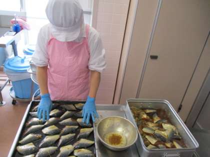 今日の魚はさばです。にんにく、ねぎ、しょうがなどの香味野菜と醤油などの調味料につけて焼きました。