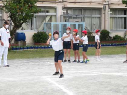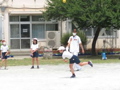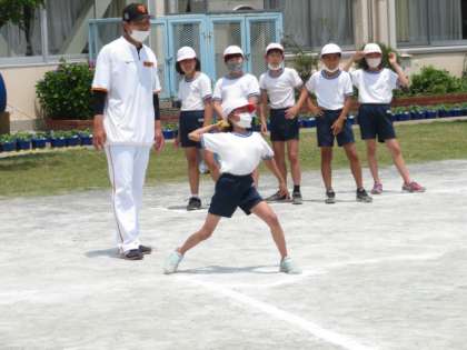 「とんくる体操」から始まり「くるっとスロー」では、肘を肩の高さまで上げる、腰を「くるっと」回転させる、後ろ足のかかとが空を向く・・・など、投げ方のコツを楽しく教えていただきました。