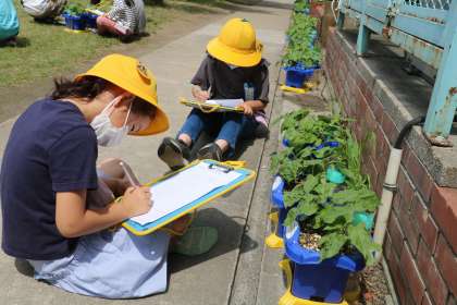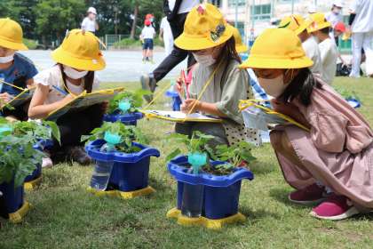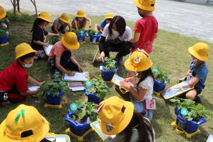 葉っぱの手触りや、においを確認したり、大きさを手と比べたり、一生懸命観察しています。