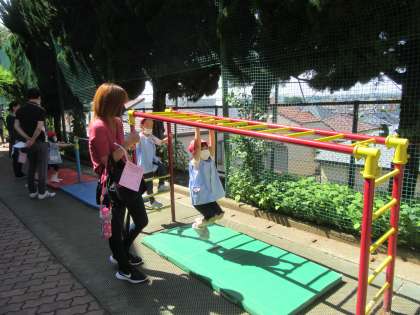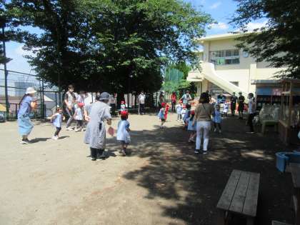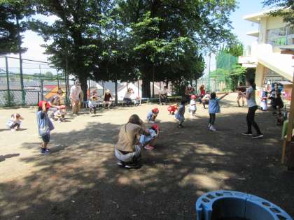 最後に園庭に集まって、「しゅりけんにんじゃ」のリズムや忍者走りでのかけっこを楽しみました。