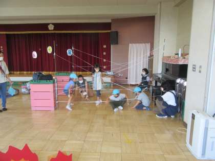 年長組の忍者修業は、手裏剣を作って手裏剣修行、刀を作ってちゃんばら修行、年少さんと同じく蜘蛛の巣くぐり、はしご渡り、一本橋渡り、トンネルくぐり、蜘蛛の巣くぐり、そして、大縄跳び、ドンじゃんけん、中当てなどです。
