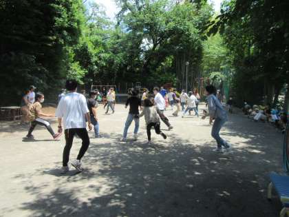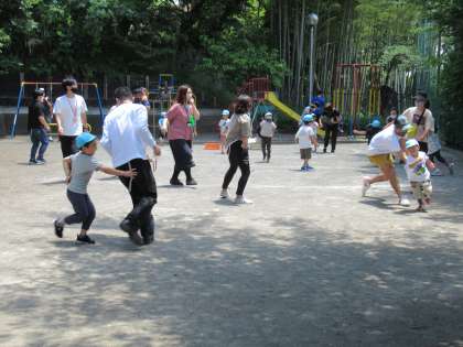 そして、最後に、各クラスの子ども対保護者のしっぽとり対決、クラスの保護者同士のしっぽとり対決をしました。保護者も手加減なしに、思い切り走ったり、しっぽを狙ったり、逃げたり。真剣勝負を楽しみました。