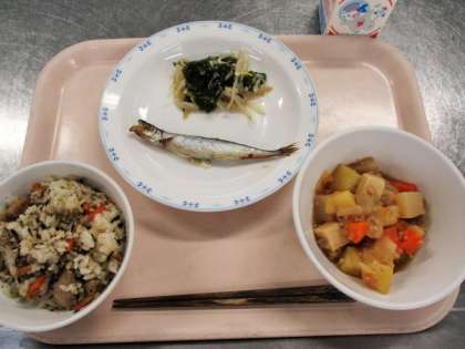 6月の給食のめあては「よくかんで食べよう」です。給食ではよくかんで食べる献立を取り入れています。ししゃものような骨ごと食べられる小魚はカルシウムがとれてじょうぶな骨や歯をつくることができます。頭からしっぽまでまるごと食べられるように香ばしく焼きました。